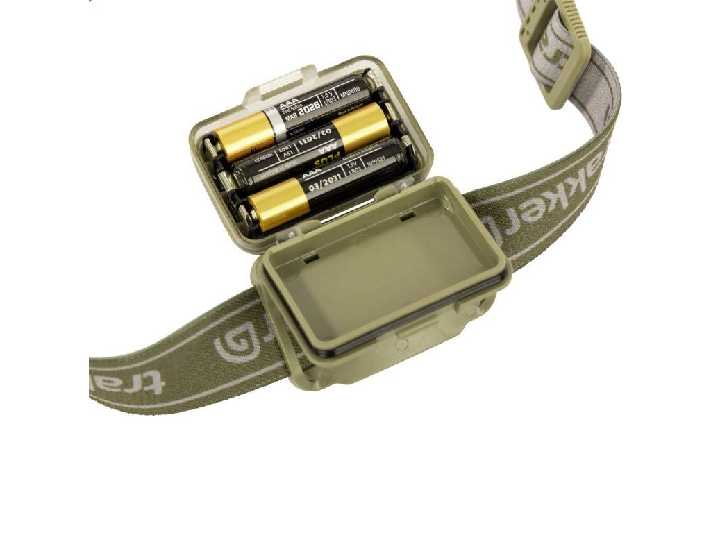 Kvalitní čelovka od značky Trakker. Vlastnosti produktu vysoká svítivost, až 220 lumenů čtyři režimy osvětlení (vysoké bílé / nízké bílé / červené konstantní / červené pohybové) čidlo pohybu vodotěsná konstrukce – IPX6 Technické parametry Odolnost proti vodě: IPX6 Baterie: 3 x AAA (nejsou součástí balení) Výdrž baterie: 5,5 hodiny (vysoká) – 8 hodin (nízká) Velikost: 60×36×44 mm Hmotnost: 68 g (bez baterií)Doplňkové parametry