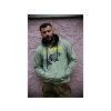 Světlá žíhaná mikina s kapucí. Kapuci lze stáhnout tkaničkami. Na předním díle mikiny je průchozí kapsa. Spodek mikiny a rukávy jsou opatřeny pružným lemem.Černý potisk.