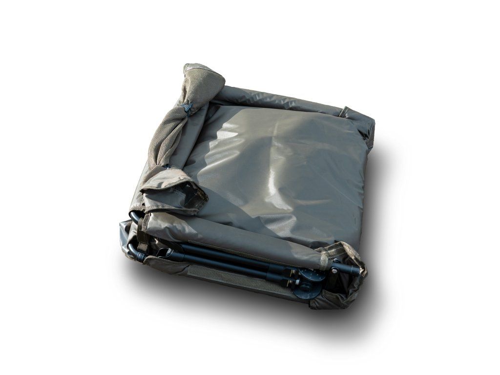 Carp Cradle Mat DLX DLX je velká kaprová kolébka s rozměry 101 x 62 x 36 cm. Je vyrobena ze Super Soft 210D vodotěsného PVC materiálu s ocelovým rámem. Má nastavitelné nohy s velkými polštáři, aby se vypořádala s nerovným či blátivým povrchem. Velmi bytelný síťový přehoz a drenážní síťka ve spodních rozích umožňují dokonalou péči o zdolanou rybu. Kolébka je skladná a snadno přenosná, váží pouhých 3,38 kg.