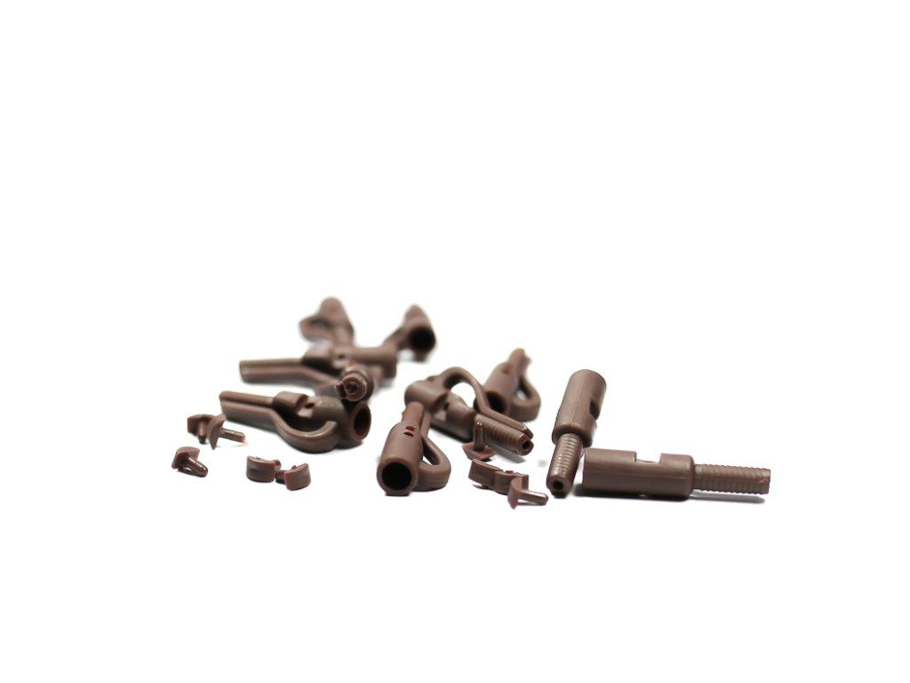 Bezpečná závěska s kolíkem umožňuje především použití obratlíků různých velikostí, a to díky kolíku, který obratlík v klipu uzamkne. Kolík je také doplňkovou ochranou, která zabraňuje vyklouznutí obratlíku z klipu při navíjení nebo záběru kapra. Princip fungování je naprosto stejný jako u běžné bezpečnostní závěsky. Závěska by měla v rizikové chvíli uvolnit olovo, aby nedošlo k poškození zdolávané ryby. Kompatibilní s našimi komponenty pro výrobu koncových montáží. Safety Lead Clip With Pin. 10 kusů v balení - hnědá barvaDoplňkové parametry